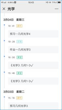 在预习阶段的设计上,李老师利用雨课堂发送预习资料的功能,在每堂课课前都会发布预习课件。课件内容主要包括两部分:一是充分利用雨课堂智慧教学平台的慕课资源,精心挑选慕课视频。慕课视频的最大优势是短小精悍,既不使学生感到冗长,又能对学生的学习给予启发;二是提出阅读本节课教材内容的要求。除此之外,李老师还给同学们推荐了williamhill中国网络教学平台上的优秀《光学》课程视频网址、国家级《光学》精品课视频网址等,让同学们根据自己的需要选择观看。