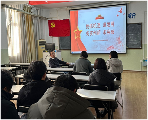 徐锡金院长首先带领大家重温了党的二十大报告的主要内容,总结了学院和物理系前期进行主题教育活动的成果,强调要坚持不懈、持之以恒,以党的二十大精神和习近平新时代中国特色社会主义思想为指南推进学院各项工作。徐院长从宏观层面分析了国家科教事业面临的现状,重点阐述了欧美国家技术封锁长期化带来的影响,以及教育数字化革命给高等教育带来的深刻变革,阐述了未来在教育、科技、人才领域的重点任务;对标国家和社会需求,徐院长强调了作为博士点专业和国家一流专业的物理学专业对学院发展的重要作用,阐述了物理系教职员工肩上承担的重要责任,鼓励大家抓住学院发展的战略机遇,精心谋划物理系发展,求真务实、锐意创新,在重点科研项目、国家和省级教学成果奖等标志性成果上力求实现新突破。
