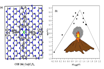 图3 COF- 366@C3N4异质结晶胞结构及氧还原反应催化过电势火山关系图。