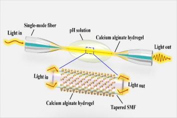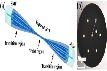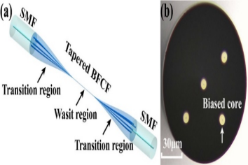 微纳光纤是包层直径处于微米或纳米量级的光纤波导,因强烈的倏逝场效应而对环境变量的微小变化显示出极高的敏感性;色散转折点是一种与常规周期性信号不同的现象,基于色散转折点的干涉仪的信号周期随着波长由短波长增加而逐渐增大,在色散转折点趋于平坦,然后周期又逐渐减小,工作在色散转折点的传感器灵敏度会有极大的提升,理论上推导计算其灵敏度可以达到无穷大。光纤传感团队将微纳光纤与色散转折点机理相结合,提出了一系列基于色散转折点的轴向应变、温度及pH微纳光纤传感器。相关工作“Axial strain and temperature sensor based on tapered biased four-core fiber operating at dispersion turning point”、“Axial strain and temperature sensor based on tapered biased seven-core fiber operating at dispersion turning point”、“A highly sensitive pH sensor based on tapered single-mode optical fiber by calcium alginate hydrogel operating at dispersion turning point”分别发表于Optics and Laser Technology、Sensors and Actuators A: Physical、IEEE Sensors Journal期刊。