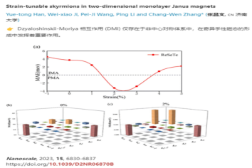 2024年,团队成员共发表SCI论文10余篇,新立项纵向科研项目2项,其中包括国家自然科学基金青年项目1项,山东省自然科学基金青年项目1项。2024年。张昌文教授入选爱思唯尔2023“中国高被引学者”榜单。张昌文教授指导研究生发表的论文“Strain-tunable skyrmions in two dimensional monolayer Janus magnets”,被编入Nanoscale 2023年最受欢迎论文专辑,以及 Nanoscale Horizons, Nanoscale 和 Nanoscale Advances 共同组织的2024 Lunar New Year Collection.