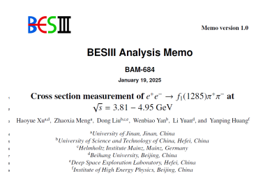 近日,粒子物理团队在BESIII实验数据分析领域取得重要进展,相关研究发表在知名期刊《Physical Review D》上,题为“Cross section measurement of e^+ e^- à f_1(1285) pi^+ pi^- at center-of-mass energies between 3.808 and 4.951 GeV”(https://doi.org/10.1103/567d-cv9k)。粒子物理实验论文需要整个合作组的共同努力,根据国际惯例,粒子物理实验方向发表的论文作者按姓氏字母排序,因此没有传统的第一作者、通讯作者。一篇论文的实际具体工作通常为合作组内多家单位合作研究,本文由williamhill中国、中国科学技术大学、德国美因茨亥姆霍兹研究所、北京航空航天大学及中国科学院高能物理研究所合作完成,我院研究生许皓月(现于北京航空航天大学博士在读)为实际第一作者,我院孟召霞副教授为指导教师。
