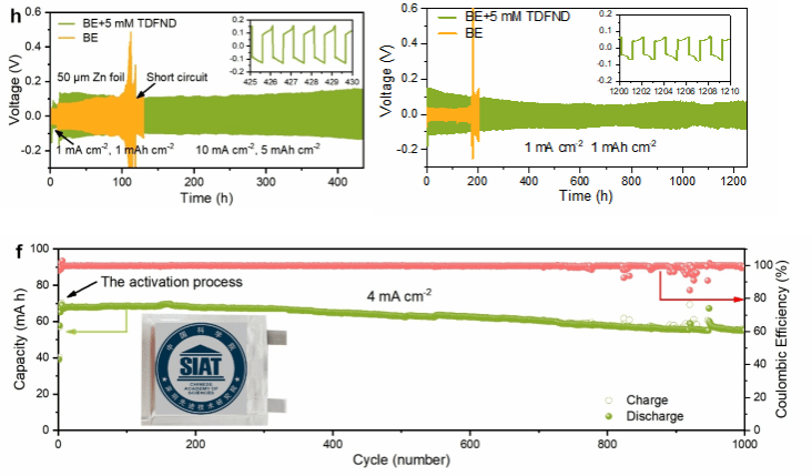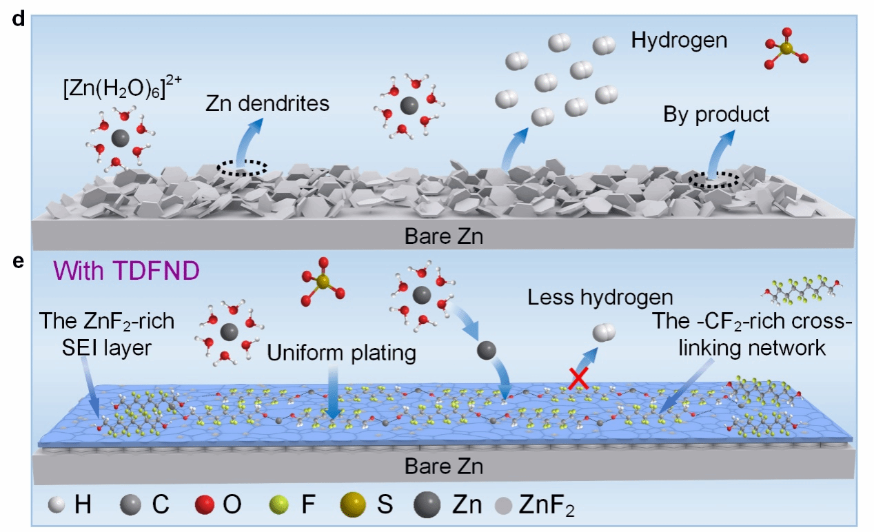 通过高分辨TEM和不同刻蚀深度的XPS表征发现,在空白电解液中引入功能性TDFND不仅可以在Zn电极表面构建富含−CF2交联网络的外层,还可以诱导形成富ZnF2的SEI内层。