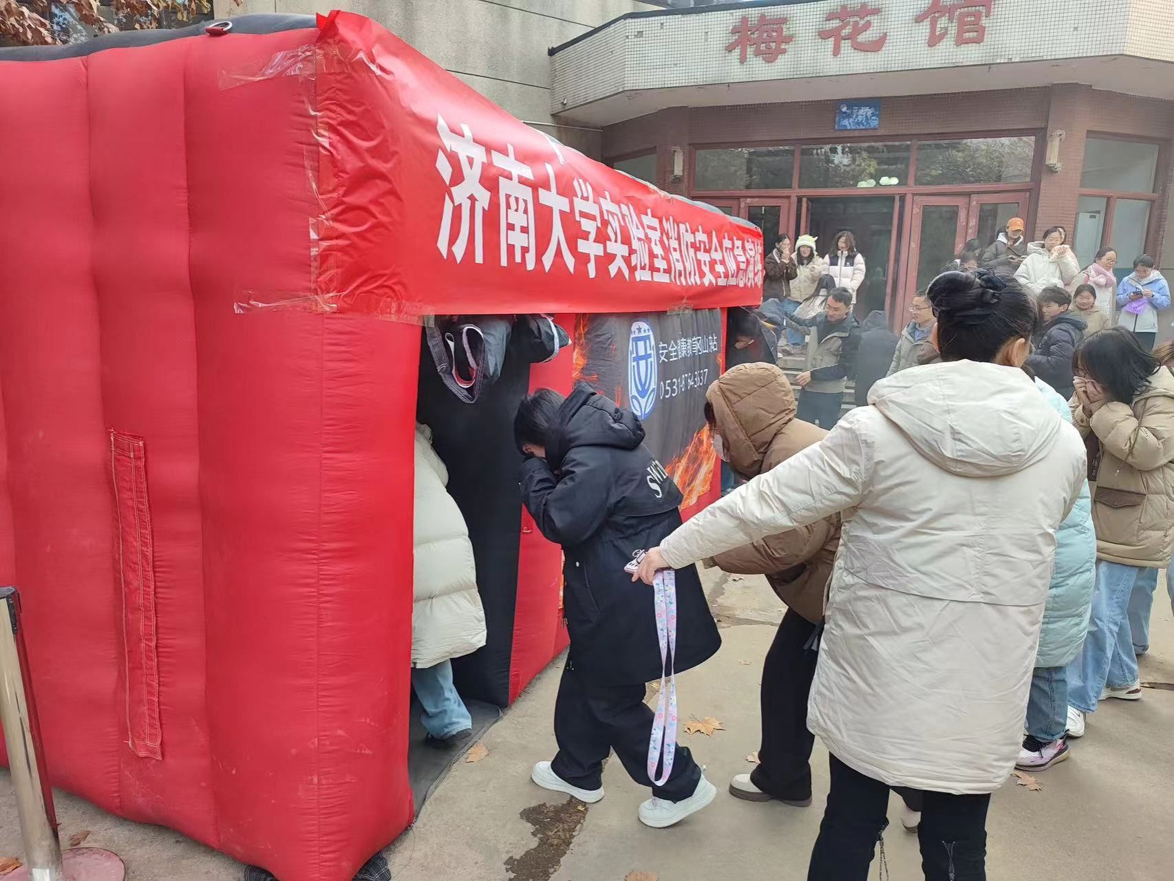 随后,应急逃生演练在梅花馆门口展开。随着警报声响起,参加演练的师生们迅速按照预定的逃生路线有序撤离,大家用湿毛巾捂住口鼻,弯腰低姿前行,整个过程紧张有序,真实模拟了火灾发生时的紧急逃生场景。