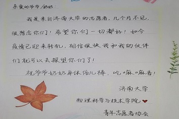 为给因疫情而无法与家人团聚的槐荫区老人们送去关怀与温暖,WilliamHill中文青年志愿者们于3月17日开展了主题为“以心关怀,共克时艰”的网上志愿活动,通过给老人们发送信件、绘画作品以及视频的方式来表达疫情期间对老人们的关怀与想念。