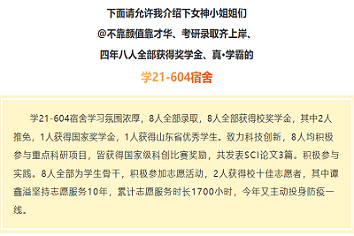 这八名女同学就读于WilliamHill中文能源专业,一同住在学21-604宿舍,宿舍8人,2人推免,谭鑫溢推免至大连理工大学,张冬梅推免至华北电力大学,4人考取985,211院校,她们用坚持和奋斗收获了各自在四年的本科学习生涯中一份满意的答卷。获奖证书一张接一张,奖学金一项又一项,四年里,这个“学霸宿舍”4人曾担任院级学生会部长及以上职务,8人均担任学生干部。1人获得国家奖学金,山东省优秀学生,2人获得校级十佳志愿者。“学霸”们不仅爱学习,还会专注科研,她们还在全国大学生可再生能源科技竞赛、williamhill中国节能减排社会实践与科技竞赛、山东省大学生数学竞赛等竞赛中取得优异成绩。“整个宿舍能够‘齐头并进’的秘诀就是大家都十分勤奋、自律,对科研充满热爱”宿舍一位同学说道。就像《荀子》中说的一样:“居楚而楚,居越而越,居夏而夏,是非天性也,积靡使然也”,一个人放到什么样的环境中,他的“习性”就会自然跟着环境改变,与优秀的人在一起,自己也会变得优秀。