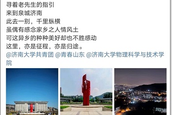 本次活动的参与形式是:登录新浪微博、抖音个人账号,搜索“爱我山东”进入主话题页面,带话题#爱我山东#,并且@青春山东,@共青团williamhill中国委员会-,发布短视频、Vlog、图片、文字等动态内容,发现山东之美,为山东代言。活动发布后,大家都积极参与,截止8月15日,物理学院共青团已经收到了数以百计的投稿,在学院范围内引发了一阵爱我山东的热潮。齐鲁大地,人杰地灵,景美情浓,在大家的投稿中,有“四面荷花三面柳,一城山色半城湖”的济南,有“历史悠久,风韵依旧”的聊城,有“会当凌绝顶,一览众山小”的泰安,也有“懒织蒲鞋罢养亲,入瞧瞑眼鼓烟尘”的烟台等等。