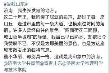 为充分发挥青年力量,以青年人的视角、青年人的话语、融媒体的方式,展现山东发展成果和良好形象,WilliamHill中文积极响应团省委号召,于8月10日至8月15日开始广泛征集“爱我山东”主题作品投稿,并号召同学们积极在新浪微博参与话题讨论。